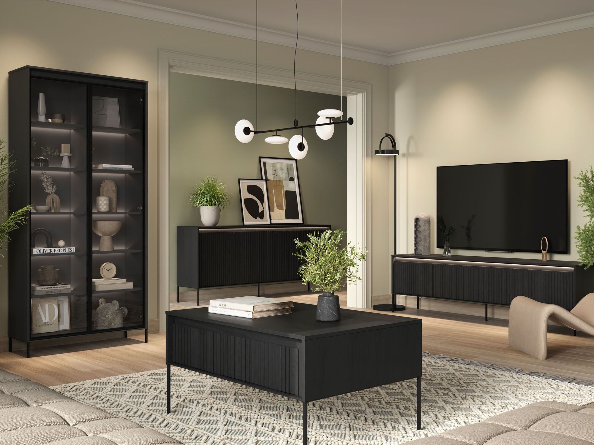 Ses lignes épurées, ses façades rainurées et son design minimaliste la rendent adaptée à de nombreux intérieurs, du moderne au scandinave en passant par le plus classique. Ce meuble est soutenu par des pieds en métal noir et possède un subtil éclairage sous forme d'un bandeau LED.