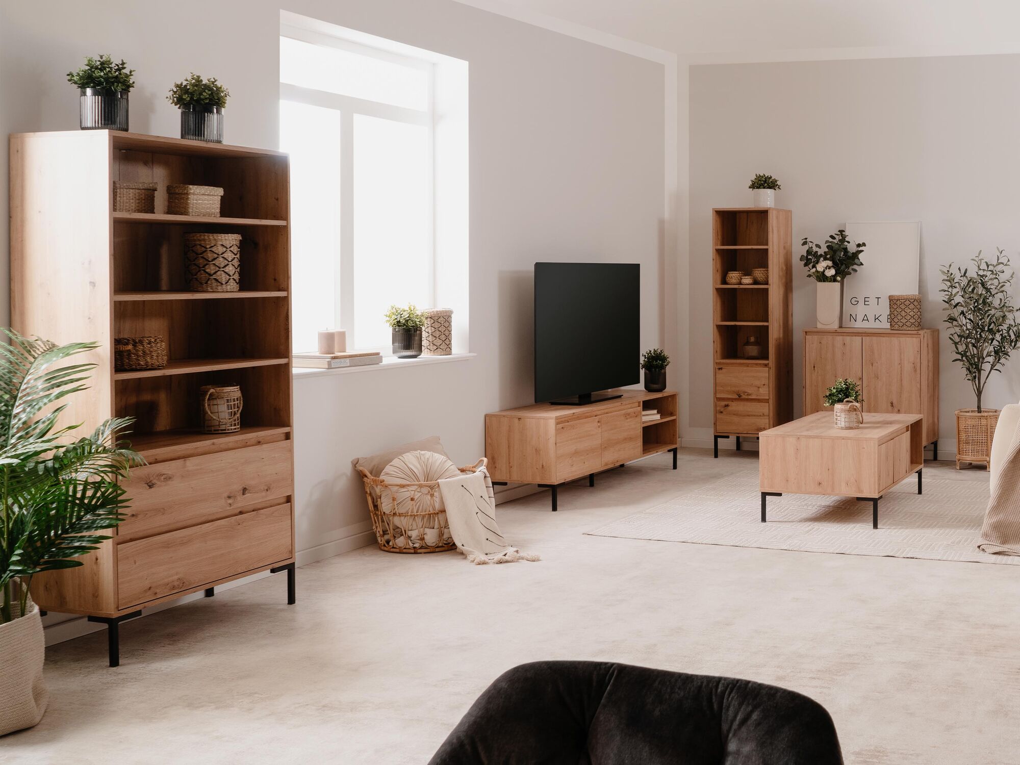 Son chaleureux coloris du bois en chêne artisan et les pieds noirs feront vraiment scintiller votre intérieur. Les rangements ne manquent absolument pas non plus, grâce aux nombreuses étagères et aux 2 tiroirs. Placez des plantes d'intérieur ou de jolis paniers tressés sur les étagères et complétez le look scandinave !