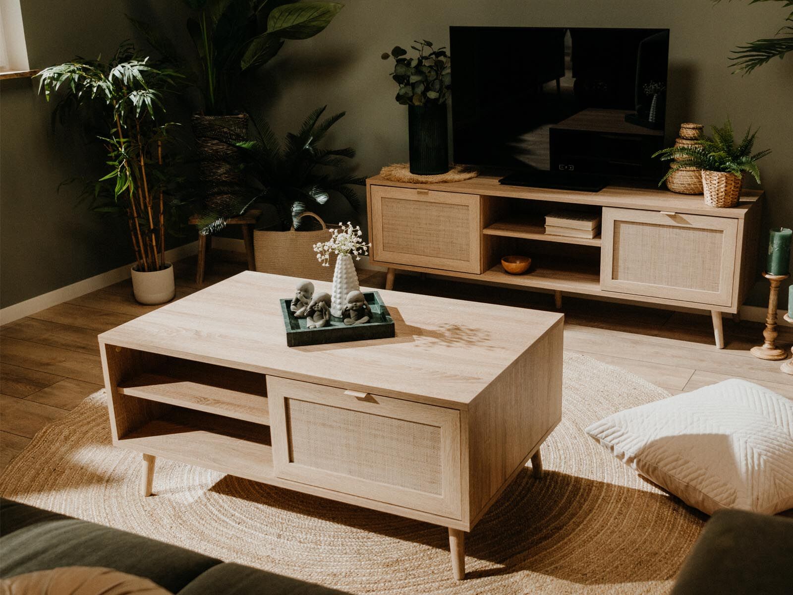 Commode haute BALO 2 portes 2 tiroirs chêne sonoma/effet roseau naturel