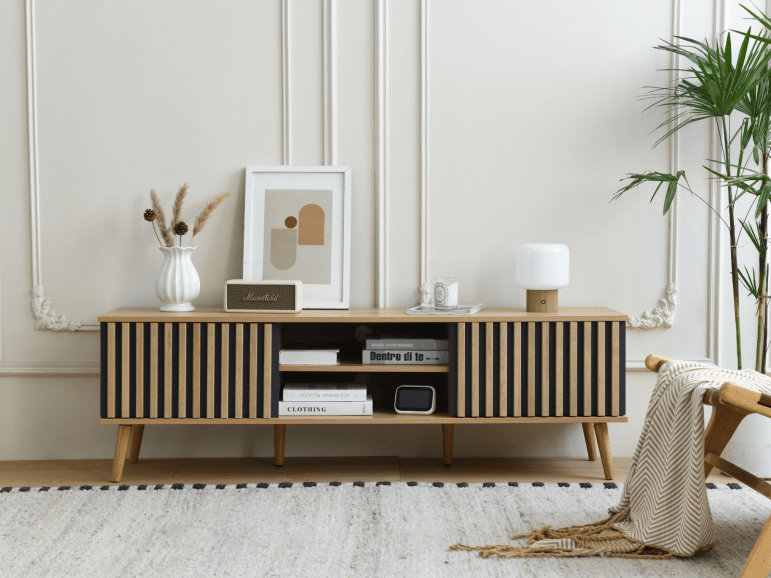 - Les portes à lamelles ajoutent un aspect visuel très tendance et raffiné. Ce détail design apporte du dynamisme au meuble.