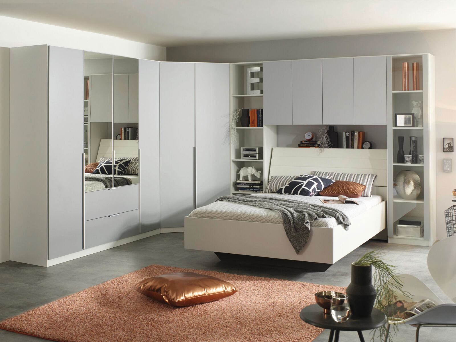 Pont de lit ELVIS 160 cm gris soie/blanc avec armoires à porte pleine