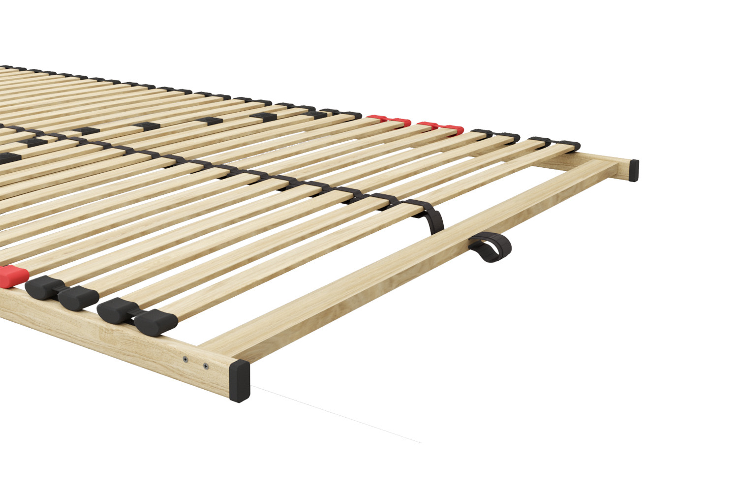 - Conception Solide : Ce sommier est composé de 28 lattes multiplis en hêtre. Fixées par deux dans des embouts en plastique, ces lattes débordent sur le cadre de relevage pour assurer une plus grande surface portante et un excellent maintien de votre matelas.